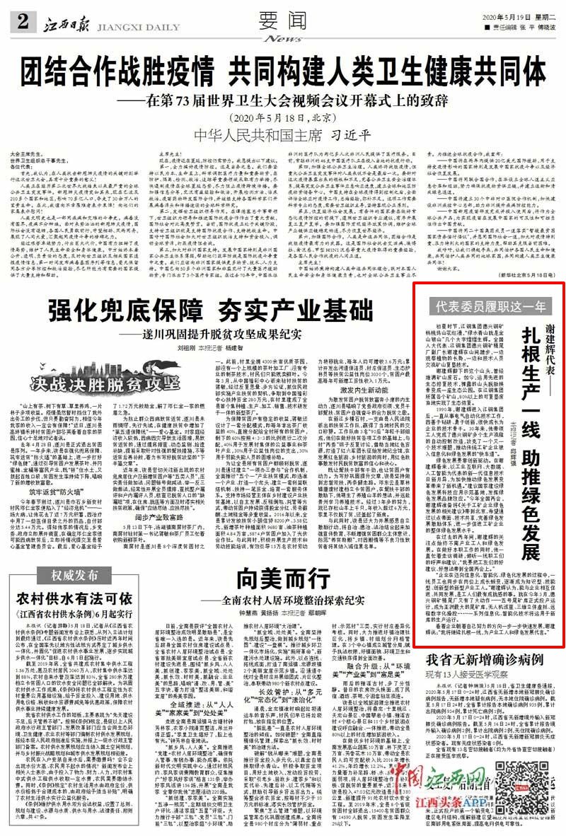 5月19,《江西日?qǐng)?bào)》“代表委員履職這一年”欄目刊登《謝建輝代表——扎根生產(chǎn)一線助推綠色發(fā)展》,報(bào)道了全國(guó)人大代表、江銅集團(tuán)德興銅礦精尾廠副廠長(zhǎng)謝建輝在參政議政、建言獻(xiàn)策、履職盡責(zé)中思考與擔(dān)當(dāng)。
